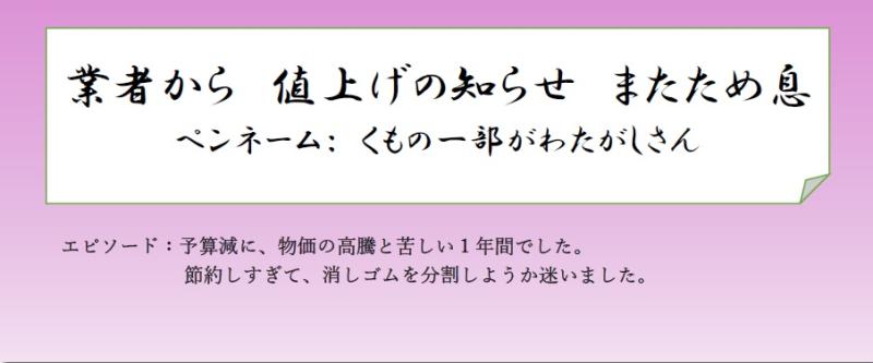 「サラリーマン川柳」「シルバー川柳」など有名な川柳がありますが、今までありそうでなかった「学校事務あるある川柳」を募集したいと思います。学校事務職員ならではの「あるある」をユーモアを交えた川柳にしてみませんか?皆様の傑作・名作・迷作?をお待ちしております!